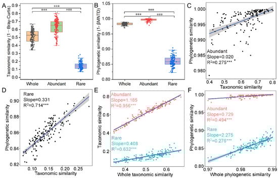 The composition similarity of the bacterial community at the taxonomic and phylogenetic levels. (A,B) Differential analysis of taxonomic similarity (1–Bray-Curtis) and phylogenetic similarity (1-βMNTD) between abundant and rare bacterial taxa at the ASVs level. (C,D) Potential association of taxonomic similarity of abundant and rare bacterial taxa with corresponding phylogenetic similarity. (E) Potential association of taxonomic similarity of abundant and rare bacterial taxa with the whole bacterial community. (F) Potential association of phylogenetic similarity of abundant and rare bacterial taxa with the whole bacterial community. Asterisks denote significance (***: p-value < 0.001).