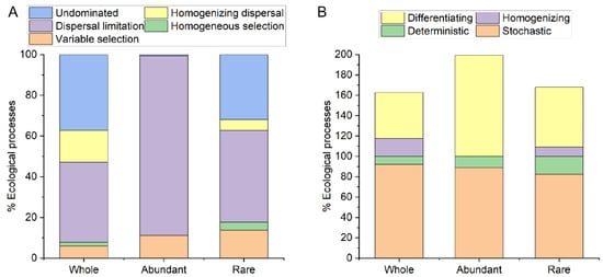 (A) Showed that the ecological processes in the assembly of abundant and rare bacterial taxa were calculated via the null model. (B) Showed that the Stochastic = Dispersal limitation + Homogenising dispersal + Undominated processes; Deterministic = Variable selection + Homogeneous selection; Homogenising = Homogeneous selection + Homogenising dispersal; Differentiating = Variable selection + Dispersal limitation.