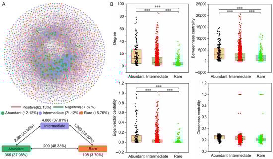 Co-occurrence patterns of the abundant, intermediate, and rare bacterial taxa in degraded grassland soils from Qinghai-Tibet Plateau. (A) Network analysis showing the intra-associations and inter-associations between different bacterial taxa. A connection was based on a strong (|r| > 0.7) and significant (p-value < 0.01) Spearman’s correlation. The size of each node is proportional to the degree. The numbers outside and inside parentheses represent the total edge numbers and negative edge numbers and their ratio, respectively. (B) Comparison of node-level topological features among three different bacterial taxa. Asterisks denote significance (***: p-value < 0.001).