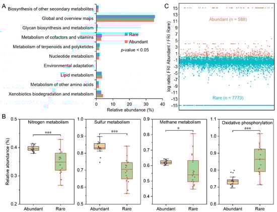 Potential ecological function difference and community functional redundancy of abundant and rare bacterial taxa in degraded grassland soils. (A) Difference of Potential ecological function between abundant and rare bacterial taxa in degraded grassland soils. Global and overview maps include the following metabolic pathways: biosynthesis of secondary metabolites, microbial metabolism in diverse environments, biosynthesis of antibiotics, carbon metabolism, 2-oxocarboxylic acid metabolism, fatty acid metabolism, degradation of aromatic compounds, and biosynthesis of amino acids. (B) Differences in potential nutrient metabolism between abundant and rare bacterial taxa in degraded grassland soils. Asterisks denote significance (*: p-value < 0.05, ***: p-value < 0.001). (C) Potential functional redundancy of abundant and rare bacterial taxa in degraded grassland soils.