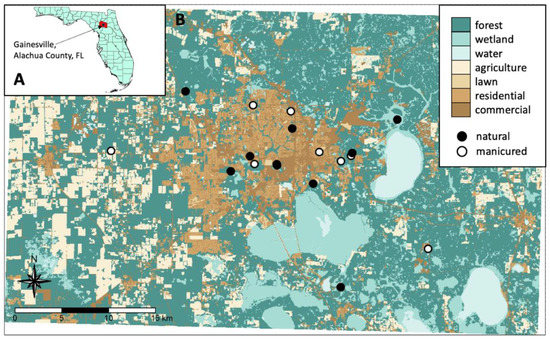 Landcover map showing (A) the State of Florida, USA, with Alachua County highlighted in red, and (B) the 17 greenspaces sampled in Gainesville, Florida, USA, and the surrounding area.