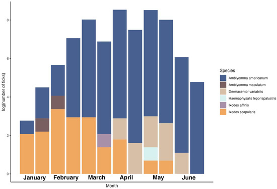 Total number of ticks (log-transformed) by species collected in 17 greenspaces in Alachua County, Florida, USA, per month (two sampling sessions per month), from January to July 2021.