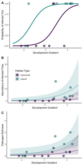 Both greenspace habitat type (natural or manicured) and the development gradient had significant relationships with the presence of an infected tick, the abundance of infected ticks, and pathogen richness (Table 5; Figure 4). An infected tick was more likely to be encountered at natural sites than manicured sites and sites surrounded by less development, regardless of habitat type. We also found the abundance of infected ticks and pathogen richness to be significantly greater in natural sites than manicured sites. Both measures also significantly increased as the forest habitat surrounding the site increased (Supplementary Table S7).