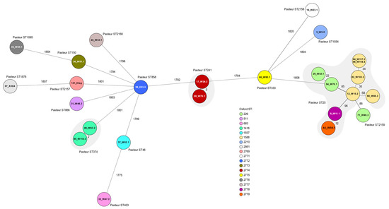 For whole-genome sequencing (WGS), 26 isolates were selected, including at least one isolate per PFGE pulsotype (cut off level of ≥80%). DNA was isolated using the Master Pure DNA Purification Kit for Blood Version II (Epicentre Biotechnologies) as published by the manufacturer. The libraries were prepared using the Nextera XT DNA Library Preparation Kit (Illumina Inc., San Diego, CA, USA) according to the manufacturer’s instructions. The 2 × 300 bp paired-end sequencing in 40-fold multiplexes was performed on the Illumina MiSeq platform (Illumina) with MiSeq Reagent Kit v3 (600-cycle) (Illumina). For sequence assembly, the Illumina reads were trimmed by Trim Galore v0.6.6 (RRID:SCR_011847) and quality checked by FastQC [37]. De novo assembling was carried out using Unicycler v0.4.9. [38]. Antimicrobial resistance genes were detected using ABRicate [39] with NCBI AMRFinderPlus [40], ResFinder [41], and CARD [42] databases. Plasmid replicons were searched for using ABRicate [39] applied to the PlasmidFinder 2.1 database (https://cge.food.dtu.dk/services/PlasmidFinder/ accessed on 21 February 2023). The databank PubMLST (https://pubmlst.org/ accessed on 21 February 2023 [43]) was used to confirm the species with ribosomal multilocus sequence typing (rMLST) [44] and to compare and identify sequence types (ST) using both the Pasteur [45] and the Oxford [46,47] scheme. New STs and new alleles were submitted to PubMLST [43]. The generated genomes were used for core genome multilocus sequence typing (cgMLST) with SeqSphere+ v7.5.5 (Ridom GmbH, Münster, Germany) [48]. This typing scheme is based on a core genome of 2390 alleles. However, the calculations for the minimum spanning tree presented here were done on the basis of only 1943 alleles as all missing values were excluded. Detected β-lactamases were compared with those listed in the Beta-Lactamase DataBase (www.bldb.eu accessed on 21 February 2023) [49]. Accession numbers and bioproject number are presented in the Data Availability section.
