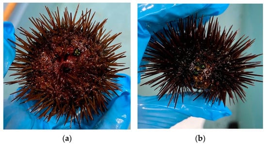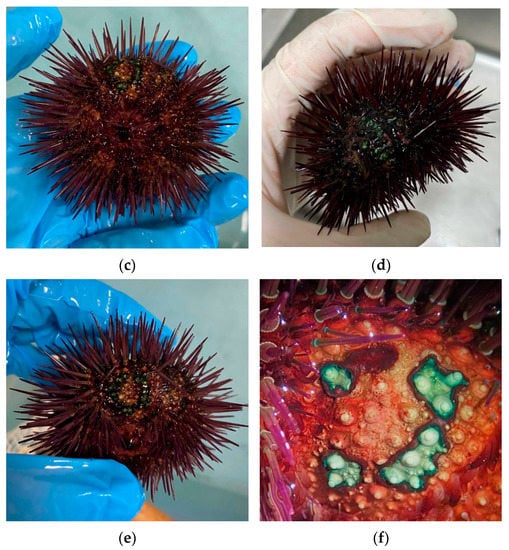 - Shimizu, M.; Takaya, Y.; Ohsaki, S.; Kawamata, K. Gross and histopathological signs of the spotting disease in the sea urchin Strongylocentrotus intermedius. Fish. Sci. 1995, 61, 608–613. [Google Scholar] [CrossRef]