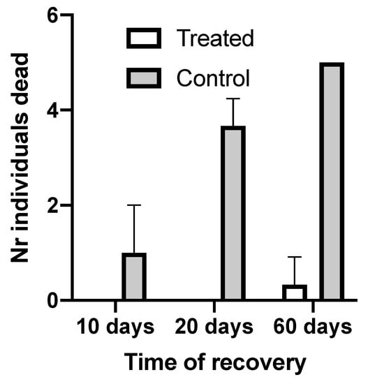 Mortality rates recorded in treated (single bath of 15 min) and control specimens, as averages of three replicates of five individuals each. The readings were performed three times during the recovery period, with clean seawater in recirculated tanks. Averages were evaluated on three replicates of five individuals, along with standard deviations among replicates (indicated by vertical bars).