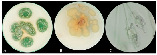 After seven days of colony development at 25 °C on PDA (potato dextrose agar) medium, colonies were 30–45 mm in diameter, had heavy sporulation, were mostly deep green in the middle and surrounded by a white border with an irregular edge, and the back was mostly a pale yellowish color and clear exudate droplets were observed (Figure 1A,B). A branched conidiophore with chains of conidia was observed under a light microscope (Figure 1C).