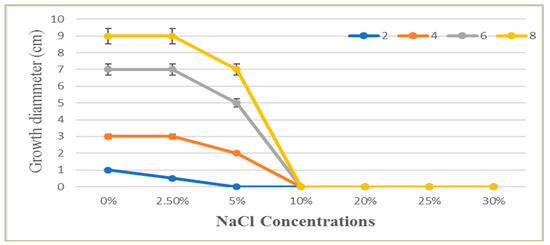 The effect of different NaCl solution concentrations (0.0–30%) on the growth of P. chrysogenum MZ945518 at different incubation times (2, 4, 6 and 8 days).