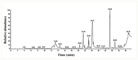 GC/MS chromatogram of the P. chrysogenum MZ945518 non-polar ethyl acetate extract.