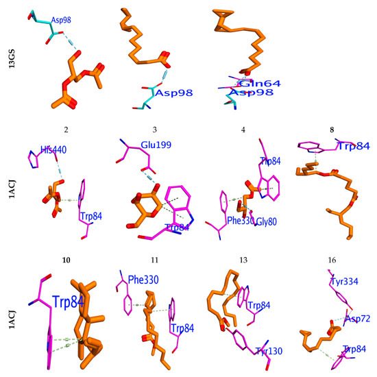 Binding mode for metabolites with the highest expected sharing in antibacterial (6M1J), antioxidant (13GS), and acetylcholinesterase “AChE” (PDB ID: 1ACJ activity.