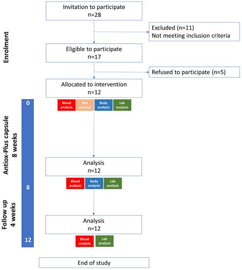 This was an open-label, single-arm, prospective clinical study designed [] and conducted over 12 weeks. To evaluate the safety and biological activity of the supplement, 12 healthy volunteers were enrolled. The study was carried out at the Faculty of Medicine at the University of Ioannina. The participants were men and women, aged 26–52 years, from which written informed consent was obtained before the study initiation. Exclusion criteria were the presence of any chronic health conditions (diabetes, hypertension, dyslipidaemia), intake of nutritional supplements over the past 60 days, heavy smokers (≥25 cigarettes/day) and high alcohol use (men > 14 drinks/week, women > 7 drinks/week). The study was approved by the Research Ethics Committee at the University of Ioannina (ID 61742/2022) and was registered at http://clinicaltrials.gov under the number NCT05679310 (access date: 10 January 2023).