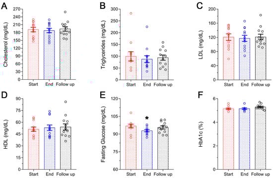 Figure 2 shows the changes in the lipid profile of the participants (Figure 2A–D) and glucose homeostasis (Figure 2E,F). A small but non-significant reduction in TC was noted at the end of the supplementation period (Figure 2A), mainly due to the reduction by 10% of triglycerides levels (Start 99.5 ± 19.7 mg/dL vs. End 87.8 ± 14.5 mg/dL) (Figure 1B). The changes in LDL-cholesterol and HDL-cholesterol were also non-significant with the former showing a reduction of 3% (Start 120.8 9.1 mg/dL vs. End 117.3 ± 8.6 mg/dL) and the latter an increase of 4% (Start 51.2 ± 2.7 mg/dL vs. End 53.0 ± 2.5 mg/dL) (Figure 2C,D). Initial levels of lipid profile were restored at follow-up (only HDL-cholesterol remained slightly elevated: Start 51.2 ± 2.7 mg/dL vs. Follow-up 54.0 ± 4.0). On the other hand, FBG was significantly reduced following the Antiox-Plus supplementation (Start 96.8 ± 1.5 mg/dL vs. End 92.8 ± 0.9 mg/dL, p < 0.05). The capsule produced an almost 5% decrease in blood glucose levels (Figure 2E). At follow-up, this significant effect on FBG levels was not observed in the participants (Start 96.8 ± 1.5 mg/dL vs. Follow up 95.6 ± 1.4 mg/dL). As expected HbA1c, a marker that changes more slowly remained stable (Figure 2F).