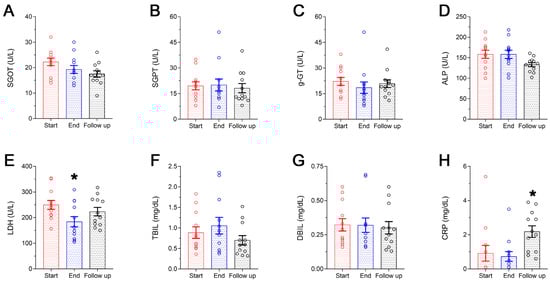 The liver function panel is presented in Figure 3A–G. No statistically significant variations were observed in the levels of SGOT, SGPT, g-GT, ALP, TBIL and DBIL (Figure 3A, Figure 3B, Figure 3C, Figure 3D, Figure 3F and Figure 3G, respectively) following 8-week supplementation with the Antiox-Plus capsule. However, a statistically significant (p < 0.05) decrease in LDH levels was recorded. Specifically, post-supplementation levels of LDH were reduced by 26% (Start 250 ± 17 U/L vs. End 184 ± 20 U/L) and were gradually increased thereafter without being restored completely to the initial levels (follow-up: 223 ± 16 U/L). CRP concentration remained within the normal range, although a significant increase was seen at the follow-up (Start 0.92 ± 0.46 mg/dL, End 0.73 ± 0.29 mg/dL, Follow up 2.2 ± 0.34 mg/dL) (Figure 3H).