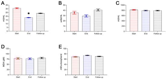 The impact of Antiox-Plus capsule supplementation on oxLDL levels was significant. OxLDL concentration reduced from 30.8 ± 2.4 mU/mL to 18.2 ± 0.9 mU/mL (p < 0.05). Cessation of the supplementation caused a 32% uprise of oxLDL levels in the plasma of the participants one month after (Follow-up); despite that, oxLDL levels remained 22% lower than baseline (Start 30.8 ± 2.4 mU/mL vs. 24.0 ± 1.1 mU/mL) (Figure 4A). No significant differences were observed in catalase activity or GSH concentration. Neither the mild fall in catalase activity at the end of the study (Start 35.5 ± 2.8 units/mL vs. End 29.3 ± 2.3 units/mL) nor its increase at follow-up (Start 35.5 ± 2.8 units/mL vs. Follow-up 40.8 ± 2.0 units/mL) was statistically significant alterations. GSH remained stable throughout the study period ranging from 820.0 ± 15.4 mU/mL at the beginning of the study to 790.5 ± 12.5 mU/mL at follow-up (Figure 4B,C). There were no considerable changes in the plasma lipid peroxidation as well as TAC of the participants during the study (Figure 4D,E).
