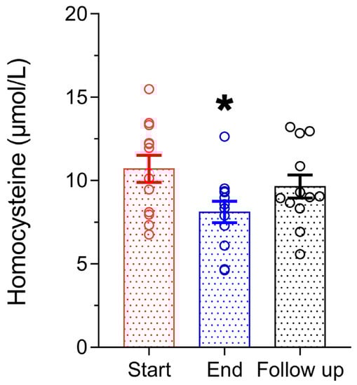 Homocysteine concentration in plasma was significantly decreased after Antiox-Plus treatment (p < 0.05). This effect was partially reset at follow-up, where homocysteine levels increased but remained lower than in the pro-supplementation period. Statistically significant difference from Start (Day 0) is shown as * (p < 0.05).