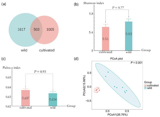 Alpha diversity and beta diversity of L. delavayi leaves. (a) Venn diagram of endophytic fungi in wild and cultivated L. delavayi leaves. (b) The Shannon index of the fungal community for wild and cultivated L. delavayi leaves. (c) The Pielou-e index of fungal community for wild and cultivated L. delavayi leaves. (d) PCoA analysis of endophytic fungal community in wild and cultivated L. delavayi. The percentage of the horizontal and vertical coordinates represents the degree of interpretation of the sample difference for the first axis and the second axis, respectively. The analysis is based on Bray–Curtis distance matrix.