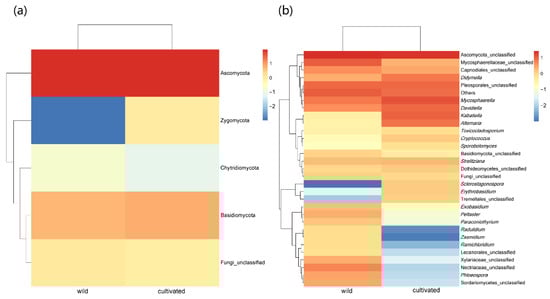 Heat maps of endophytic fungi in wild and cultivated L. delavayi leaves at the phylum level (a) and the genus level (b). In the figure, the gradient from blue to red represents the change of abundance from low to high. After Z-value transformation, the heat map normalizes the expression abundance of the same fungi.