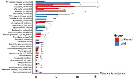 Barplot difference analysis of endophytic fungi at species level in wild L. delavayi and cultivated L. delavayi leaves. All species were analyzed for differences, and the species with p-value less than 0.05 (Wilcoxan test) were screened to draw a histogram (basically including all differential species). In the figure, * represents 0.01 < p < 0.05, ** represents 0.001 < p < 0.01, and *** represents p < 0.001. The ordinate in the figure represents the different species (arranged from left to right according to the abundance), and the abscissa is the relative abundance.