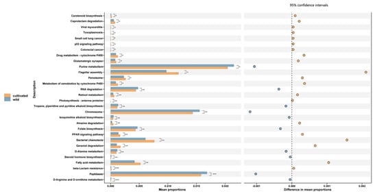 STAMP difference analysis of functional predictions of endophytic fungi in wild and cultivated L. delavayi leaves based on the KEGG database (level 3). The STAMP analysis results in the figure only apply to the first 30 functions with p < 0.05 in the t−test difference test results of two comparisons. In the figure, * represents 0.01 < p < 0.05, ** represents 0.001 < p < 0.01, and *** represents p < 0.001. The results showed statistically significant functions (95% confidence intervals).