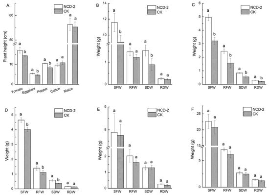 Effect of Bacillus subtilis NCD-2 on the growth indices of different crops. (A) Plant height; (B) plant fresh and dry weight of tomato; (C) plant fresh and dry weight of eggplant; (D) plant fresh and dry weight of pepper; (E) plant fresh and dry weight of cotton; (F) plant fresh and dry weight of maize. SFW represents shoot fresh weight, RFW represents root fresh weight, SDW represents shoot dry weight and RDW represents root dry weight. Each value is the mean of three replicates. Bars with the same lowercase letters indicate no significant difference between treatments based on Student’s t-test (p < 0.05). NCD-2 represents treatment with B. subtilis NCD-2, CK represents treatment with blank control.