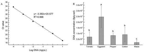 The DNA concentrations of strain NCD-2 ranged from 100 fg/μL to 10 ng/μL and were used as templates for real-time PCR amplification. A good PCR amplification efficiency (E = 97.5%) was obtained from the standard curve y = −3.392x + 20.577, with a strong correlation (R2 > 0.99) between the quantity of B. subtilis strain NCD-2 target DNA (x) and the corresponding Ct (y) values (Figure 2A). The DNA concentration of strain NCD-2 was calculated according to the standard curve, and the population of strain NCD-2 in the rhizosphere soils from different crops was obtained. The results showed that strain NCD-2 had the highest DNA concentration of 24.6 pg/g soil in the eggplant rhizosphere and the lowest DNA concentration of 2.1 pg/g soil in the maize rhizosphere. The DNA concentrations of strain NCD-2 in the rhizospheres of cotton, pepper and tomato were similar at 9.05 pg/g soil, 8.26 pg/g soil and 6.98 pg/g soil, respectively (Figure 2B).