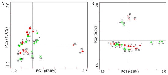 Principal component analysis of the soil bacterial (A) and fungal (B) communities collected from different treatments. 1–6 represent pepper, 7–12 represent tomato, 13–18 represent cotton, 19–24 represent eggplant, 25–30 represent maize. Red represents blank control (CK) treatment, green represents the treatment of strain NCD-2.