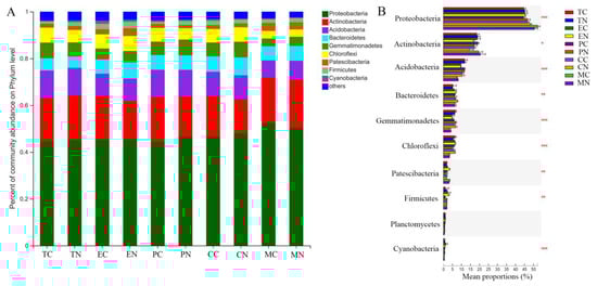 Analysis of compositions of bacterial communities from CK and NCD-2 treatments in different crops. (A) Percentage of community abundance at phylum level for each crop; (B) Significant analysis of community abundance at the phylum level. *, ** and *** means significantly at p < 0.05, p < 0.01 and p < 0.001 level, respectively. NCD-2 represents treatment with B. subtilis NCD-2, CK represents treatment with blank control. TC, tomato-CK; TN, tomato-NCD-2; EC, eggplant-CK; EN, eggplant-NCD-2; PC, pepper-CK; PN, pepper-NCD-2; CC, cotton-CK; CN, cotton-NCD-2; MC, maize-CK; MN, maize-NCD-2.