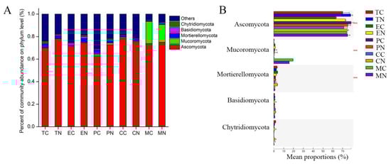 Analysis of compositions of fungal communities from CK and NCD-2 treatments in different crops. (A) Percentage of community abundance at phylum level for each crop; (B) Significant analysis of community abundance at the phylum level. *** means significantly at p < 0.001 level. NCD-2 represents treatment with B. subtilis NCD-2, CK represents treatment with blank control. TC, tomato-CK; TN, tomato-NCD-2; EC, eggplant-CK; EN, eggplant-NCD-2; PC, pepper-CK; PN, pepper-NCD-2; CC, cotton-CK; CN, cotton-NCD-2; MC, maize-CK; MN, maize-NCD-2.