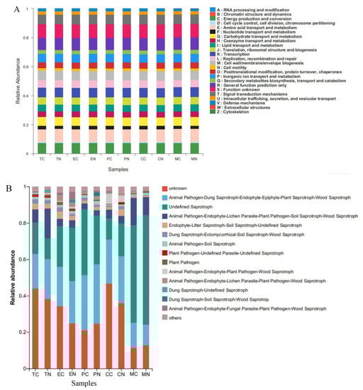 Predicted relative abundances of functional gene for bacteria and fungi by PICRUSt and FUNGild. (A) Bacteria; (B) Fungi. TC, tomato-CK; TN, tomato-NCD-2; EC, eggplant-CK; EN, eggplant-NCD-2; PC, pepper-CK; PN, pepper-NCD-2; CC, cotton-CK; CN, cotton-NCD-2; MC, maize-CK; MN, maize-NCD-2.