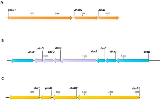 - Raynaud, C.; Sarçabal, P.; Meynial-Salles, I.; Croux, C.; Soucaille, P. Molecular characterization of the 1,3-propanediol (1,3-PD) operon of Clostridium butyricum. Proc. Natl. Acad. Sci. USA 2003, 100, 5010–5015. [Google Scholar] [CrossRef]