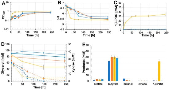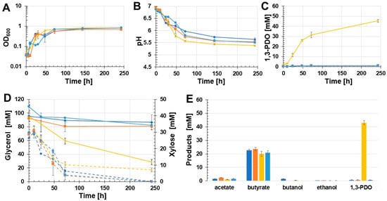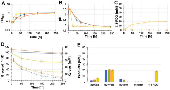 Results of the batch growth experiment with unbuffered glycerol medium performed with the recombinant strains C. beijerinckii [pMTL83251_Ppta-ack_1,3-PDO.diolis], C. beijerinckii [pMTL83251], and the wild-type C. beijerinckii strain. OD600 (A), pH (B), 1,3-PDO production (C), substrate consumption (D), and concentration of products (E). Wild-type: blue rhombus; C. beijerinckii [pMTL83251]: orange squares; C. beijerinckii [pMTL83251_Ppta-ack_1,3-PDO.diolis]: yellow crosses; glycerol consumption: solid lines; xylose consumption: dashed lines; error bars represent standard deviations, n = 3.
