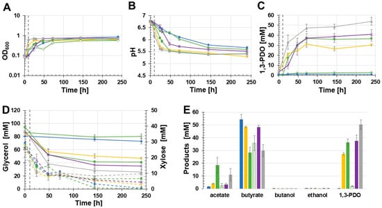 Since the used glycerol dehydratase of C. pasteurianum is coenzyme B12-dependent, the effect of supplementation of vitamin B12 in the MOPS-buffered growth medium of C. beijerinckii [pMTL83251_PthlA_dhaBCET.Cpas] was studied. Therefore, the glycerol medium of C. beijerinckii [pMTL83251_PthlA_dhaBCET.Cpas] was supplemented with vitamin B12. The results are shown in Figure 5. During this growth experiment, the recombinant strain C. beijerinckii [pMTL83251_Ppta-ack_1,3-PDO.diolis] grew slower than during previously described growth experiments. Cells reached the stationary phase after 48 h with an OD600 of 0.62. As reported before, a decrease of the OD600 after 24 h and 48 h was observed for C. beijerinckii [pMTL83251_PthlA_dhaBCET.Cpas] as well as the wild-type strain and C. beijerinckii [pMTL83251]. After 243 h of incubation, the OD600 values of C. beijerinckii [pMTL83251_PthlA_dhaBCET.Cpas], C. beijerinckii [pMTL83251_Ppta-ack_1,3-PDO.diolis], and the wild-type were similar; only the OD600 of C. beijerinckii [pMTL83251] was lower with a value of 0.69 (Figure 5A). In parallel to the slower growth, the pH of the culture broth of C. beijerinckii [pMTL83251_Ppta-ack_1,3-PDO.diolis] also dropped slower than described for the previous experiments (Figure 5B). Throughout the growth experiment, C. beijerinckii [pMTL83251_Ppta-ack_1,3-PDO.diolis] produced 43.1 mM 1,3-PDO. Again, the three other C. beijerinckii strains synthesized only traces of 1,3-PDO (wild-type and C. beijerinckii [pMTL83251]: 0.7 mM; C. beijerinckii [pMTL83251_PthlA_dhaBCET.Cpas]: 0.6 mM) (Figure 5C). The 1,3-PDO-producing strain C. beijerinckii [pMTL83251_Ppta-ack_1,3-PDO.diolis] consumed 66.9 mM glycerol during batch growth. C. beijerinckii [pMTL83251_PthlA_dhaBCET.Cpas] used 27.3 mM glycerol. The two control strains consumed only around 10 mM glycerol. In contrast, xylose was consumed completely by the wild-type strain, C. beijerinckii [pMTL83251], and C. beijerinckii [pMTL83251_PthlA_dhaBCET.Cpas] (Figure 5D). In the case of C. beijerinckii [pMTL83251_Ppta-ack_1,3-PDO.diolis], 1,3-PDO was the main product. Compared to the other three tested strains, C. beijerinckii [pMTL83251_Ppta-ack_1,3-PDO.diolis] showed the lowest butyrate (19.9 mM) and acetate (1.1 mM) concentrations. The highest butyrate and acetate amounts were observed with the control strain C. beijerinckii [pMTL83251], i.e., 23.6 mM butyrate and 2.4 mM acetate. C. beijerinckii [pMTL83251_PthlA_dhaBCET.Cpas] produced 20.9 mM butyrate and 1.6 mM acetate during growth. The wild-type strain produced butyrate (22.7 mM), acetate (1.5 mM) and butanol (1.4 mM). Traces of butanol were also observed in cultures of C. beijerinckii [pMTL83251_Ppta-ack_1,3-PDO.diolis] (0.4 mM). All examined C. beijerinckii strains synthesized traces of ethanol (0.3–0.2 mM). An overview of the products is provided in Figure 5E. Overall, a benefit of the vitamin B12 supplementation could not be observed.