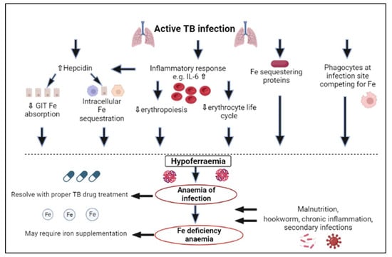Tuberculosis patients are burdened with excessive non-resolving inflammation with resultant debilitating consequences, including lung tissue necrosis and cavitation [4,5]. Furthermore, anaemia, also resulting from inflammation, is a common complication in TB patients. Normocytic normochromic anaemia has been reported to be present in up to 71.7% of TB patients [6,7,8,9,10,11,12,13]. Additionally, depending on the population and the relevant contributing factors, 1-53% of TB patients suffer from iron deficiency anaemia (IDA) [8,9,14]. Populations at risk for TB are frequently from a low-socio-economic background, where undernutrition may lead to micronutrient deficiencies, including iron deficiency (ID) [15,16]. Furthermore, intestinal helminth infection before TB infection and co-infection of TB patients with helminths may cause IDA [17,18]. Due to the importance of iron in immunity, ID and anaemia in TB patients have been associated with slower sputum conversion rates, higher mortality rates and the reoccurrence of TB [3,7,8,9]. However, the relationship between iron availability, the TB bacterium and the host immune response is complex; therefore, it is difficult to identify the need and benefit of iron supplementation [19,20]. This review aimed to summarise the literature available on ID and anaemia in TB and the possible role of iron supplementation in addressing these complications.