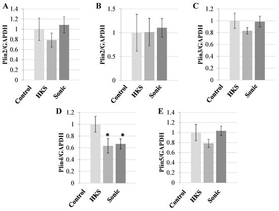 The effects of Bifidobacterium breve MCC1274 extract on perilipin gene expression in SH-SY5Y cells. The SH-SY5Y cells were exposed to B. breve MCC1274 heat-killed supernatant (HKS) or sonicated supernatant (Sonic) for 1 h at a 1% v/v final concentration. The expression of human perilipin mRNA genes relative to human GAPDH by RT-PCR (A–E). The data are shown as the mean +/− standard deviation (SD) of six replicates. * p < 0.05, vs. Control (non-repeated measures ANOVA with the Bonferroni post hoc test).