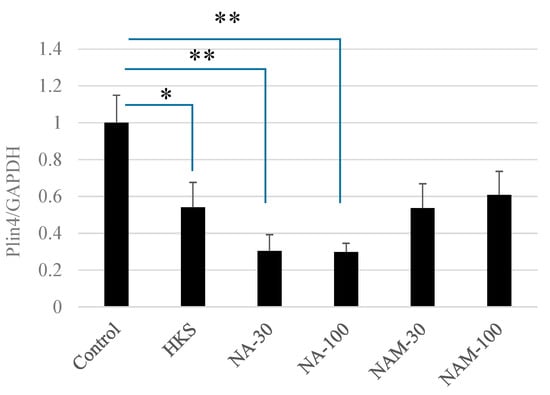 Bifidobacterium breve MCC1274 extracts and niacin reduce PLIN4 mRNA expression in SH-SY5Y neuroblastoma cells. The SH-SY5Y cells were exposed to HKS (B. breve MCC1274 heat-killed cell extracts, 1% final v/v), niacin (NA), or niacinamide (NAM) (final concentration of 30 or 100 nM) for 1 h. Human PLIN4 mRNA expression relative to human GAPDH was determined by RT-PCR. The data are shown as the mean + SD of three replicates. * p < 0.05, ** p < 0.01 (non-repeated measures ANOVA with the Bonferroni post hoc test).