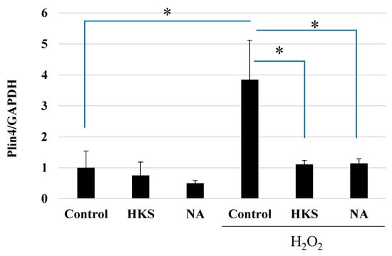 Bifidobacterium breve MCC1274 extracts and niacin protect SH-SY5Y cells against oxidative stress caused by exposure to H2O2. The SH-SY5Y cells were exposed to HKS (B. breve MCC1274 heat-killed cell extracts, 1% v/v) or niacin (NA, 100 nM) with or without H2O2 (200 µM) for 24 h. Human PLIN4 mRNA expression relative to human GAPDH expression was determined by RT-PCR. The data are shown as the mean + SD of four replicates. * p < 0.05 (Student’s t-test for two-group or non-repeated measures ANOVA with the Bonferroni post hoc test for multiple-group comparison, respectively).