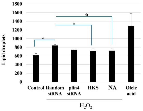 Bifidobacterium breve MCC1274 extracts and niacin suppress lipid droplet formation in SH-SY5Y cells. The SH-SY5Y cells were exposed to siRNA (random siRNA or PLIN4 siRNA), HKS (B. breve MCC1274 heat-killed cell extracts, 1% final v/v), or NA (100 nM) in the presence of H2O2 (200 µM) for 24 h and then stained with BODIPY (2 µM). Untreated cells were used as a control. Oleic acid (60 µM) was used as a control to confirm the induction of lipid droplets. The y-axis shows the FITC signal as measured by flow cytometry. The data are shown as the mean + SD of three replicates. * p < 0.05 (Student’s t-test for two-group or non-repeated measures ANOVA with the Bonferroni post hoc test for multiple-group comparison, respectively).