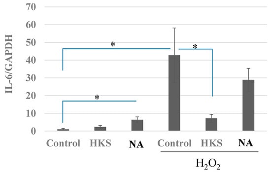 Bifidobacterium breve MCC1274 extracts and niacin prevent the increase in IL-6 expression induced by oxidative stress. The SH-SY5Y cells were exposed to HKS (B. breve MCC1274 heat-killed cell extracts at 1% v/v final concentration) or niacin (NA, 100 nM), with or without H2O2 (200 µM), for 24 h. Human interleukin-6 (IL-6) mRNA expression relative to human GAPDH expression was determined by RT-PCR. The data are shown as the mean + SD of four replicates. * p < 0.05 (Student’s t-test for two-group or non-repeated measures ANOVA with the Bonferroni post hoc test for multiple-group comparison, respectively).
