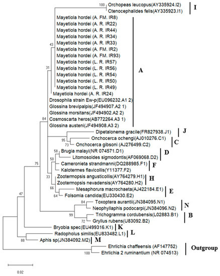 Maximum likelihood phylogenetic tree of the 13 Wolbachia strains found in barley stem gall midges based on 16S rRNA gene sequences (325 bp) (A: adult, L: larva, R: Rabat, FM: Fes-Meknes). Host species and the GenBank accession numbers are indicated for sequences of representatives of the Wolbachia supergroups A−N. Numbers in each node are bootstrap proportions based on 1000 replications (only values higher than 30% are shown).