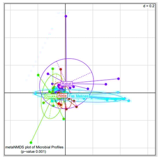 The bacterial communities of BSGM were clustered according to their geographic origins. The NMDS plots based on the generalized UniFrac distance revealed that samples from Rabat, Fes-Meknes, Abda, and Doukkala were significantly separated (PERMANOVA, p < 0.001, Figure 2), with similar results also obtained with pairwise analyses (Supplementary Figure S1).