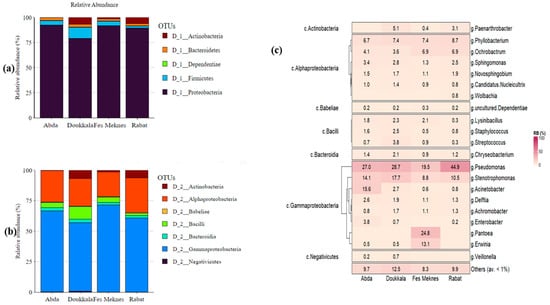 Relative abundance of natural barley stem gall midge populations’ microbiota at the phylum (a), class level (b), and heat map (c) of bacterial genera and classes identified in barley stem gall midge populations from the regions of Rabat, Fes-Meknes, Abda, and Doukkala.