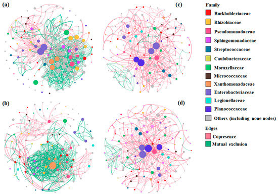 Co-occurrence and mutual exclusion network analysis was performed to examine the potential interactions between bacterial partners in each region separately. The networks for each region were shown at the family (Figure 5) and genus (Figure S3) levels. The number of OTUs (nodes), interactions (edges), and clustering coefficients varied amongst the four regions. The Fes-Meknes region had the highest number of nodes (144), followed by Rabat, Doukkala, and Abda (137, 132, and 122, respectively). Bacterial communities from Fes-Meknes had more interactions (1179) and a lower clustering coefficient (0.135) than Rabat (1177 edges and 0.215 coefficient), Doukkala, and Abda (395 edges and 0.215 coefficient, 350 edges and 0.041 coefficient, respectively). At the family level, mutual exclusions accounted for the majority of interactions in Doukkala and Abda (91.39% and 75.31%, respectively) (Figure 5c,d), while in the two left regions, Fes-Meknes and Rabat (Figure 5a,b), copresence accounted for the majority of the interactions (72.87% and 64.03%, respectively), with Proteobacteria dominating interactions in all four regions. At the genus level, Stenotrophomonas showed the highest degree of interactions in Rabat, Erwinia in Fes-Meknes and Doukkala, and Lysinibacillus in Abda.