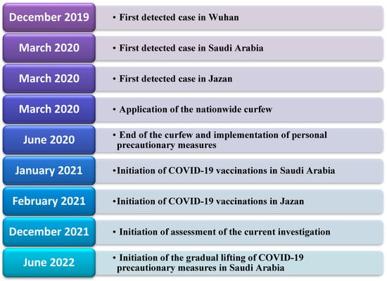 This cross-sectional study was conducted in the Jazan region of southwest Saudi Arabia. Jazan Health Affairs offers its services to more than almost 1.4 million people in 14 cities and numerous villages. Figure 1 illustrates the timeline of COVID-19 in the region and the performance of the assessment in the current investigation. The target population included all vaccinated people from February 2021 to July 2021. This investigation was performed after securing ethical approval from the Jazan Health Ethics Committee (approval number 2184, dated October 2021). Informed consent was secured from the study participants before enrolment, and the study was performed according to the principles of the Declaration of Helsinki.