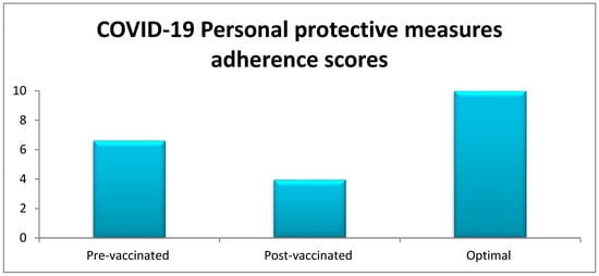 Optimal adherence scores regarding personal protective measures against COVID-19 and comparisons between the scores of pre-vaccinated and post-vaccinated participants in the Jazan region of Saudi Arabia.