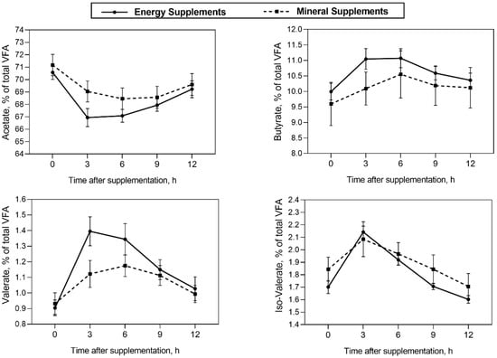 Interaction effect of type of supplement × time after supplementation on the ruminal proportion of acetate (p < 0.001), butyrate (p < 0.001), valerate (p < 0.001), and isovalerate (p = 0.008) in Nellore cattle grazing Urochloa brizantha cv. Marandu supplemented with energy supplements or mineral supplements.
