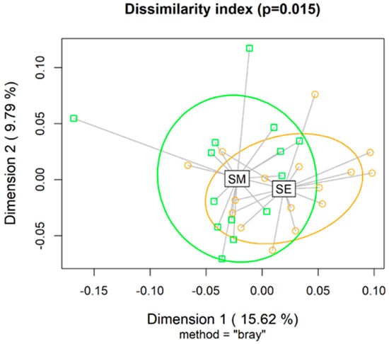 Beta-diversity Bray–Curtis index computed for nonparametric statistical tests between rumen microbial communities of Nellore cattle grazing Urochloa brizantha cv. Marandu and supplemented with energy supplements (SEs) or mineral supplements (SMs). There were no observed effects of the addition of a phytogenic compound blend containing 10% of carvacrol and cinnamaldehyde oil, and 90% hydrolyzable tannins extracted from berries and grapes at a dose of 1.5 g/kg of ingested dry matter.