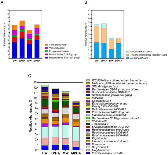 At the family level, 16 bacterial families were identified, with the most abundant being Lachnospiraceae (17.73%), Ruminococcaceae (14.90%), and Prevotellaceae (13.46%). The relative abundance of the Bacteroidales S24-7 group and the Veillonellaceae families in the rumen was influenced by the interaction between the type of supplement provided and the use of the PHA (Figure 3A). Specifically, the relative abundance of the Veillonellaceae family was lower in steers supplemented with the EPHA compared to those supplemented with other supplements (p = 0.007), and the Bacteroidales S24-7 group (p = 0.084) tended to be lower in steers supplemented with the MW. In addition, steers supplemented with the PHA showed a higher ruminal abundance of the Bacteroidales BS11 gut group (p = 0.024).