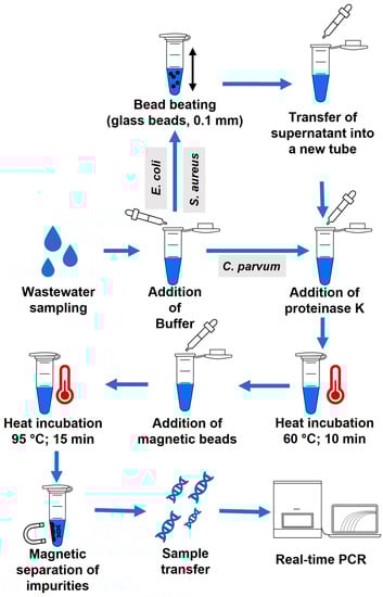 A total of 107 (S. aureus) and 108 (E. coli) bacterial cells and 105 oocysts of C. parvum were counted with an Olympus BX40 microscope (Microscopy Technologies, Tokyo, Japan), using a Neubauer Chamber—An amount of 200 µL of wastewater, provided as unfiltered influent water retrieved from the sewage treatment plant Greifswald-Ladebow, Greifswald, Germany, was spiked with the bacterial cells and oocysts. A tenfold serial dilution of the spiked wastewater was prepared. For the DNA extraction of S. aureus and E. coli, 200 µL of each dilution was mixed with 200 µL DLN Buffer and the procedure was continued as described in Section 2.2.3. using 0.1 mm glass beads and the Vortexer for BB. In the case of C. parvum, protocol II (Table 1) with DLN buffer was used. Nucleic acids of each dilution after extraction were tested using real-time PCR. For the determination of LOD, this was repeated three times. The detailed protocols of the DNA extractions can be found in the supplementary (S2). A layout of the final extraction procedure is illustrated in Figure 1.