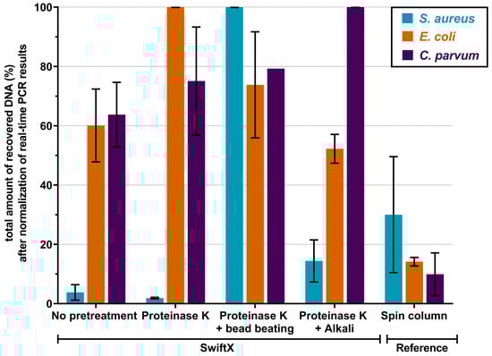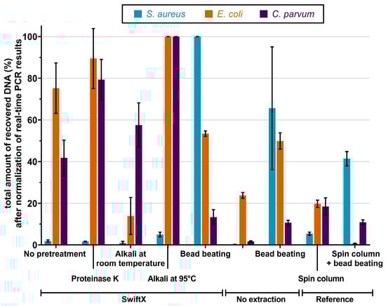 Performance of various extraction protocols with and without pre-treatment. The percentage of recovered DNA for different pre-treatment protocols was measured after the normalization of real-time PCR results. Cell suspension of 107 bacterial cells of S. aureus, 108 bacterial cells of E. coli or 106 oocysts of C. parvum was pelleted and extracted. DNA was measured by real-time PCR. The highest percentage of recovered DNA was achieved using SwiftX with bead beating in the case of S. aureus. SwiftX with proteinase K or alkaline treatment for E. coli and C. parvum revealed the best DNA recovery rate.