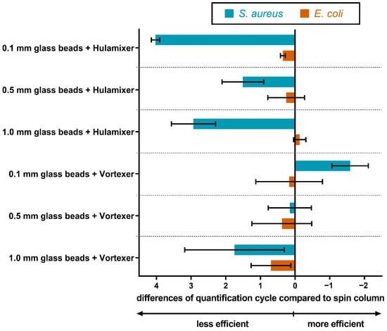 Effect of glass bead size and bead beating force on the extraction performance. To identify the optimal protocol for DNA recovery, SwiftX was combined with bead beating using glass beads with different sizes (0.1 mm, 0.5 mm or 1.0 mm). The real-time PCR results of SwiftX protocols and the spin column reference technique were compared. The use of 0.1 mm glass beads combined with the Vortexer showed the best results for S. aureus, while equal performance was achieved for E. coli.